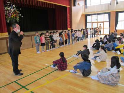 たくさんの上級生を前にして並んだ1年生の子ども達は、少し緊張した表情をしていました。担任の先生がきのうの入学式の様子をお話しして、続けて1年生のみんなで「よろしくお願いします。」と声をそろえてあいさつをしました。