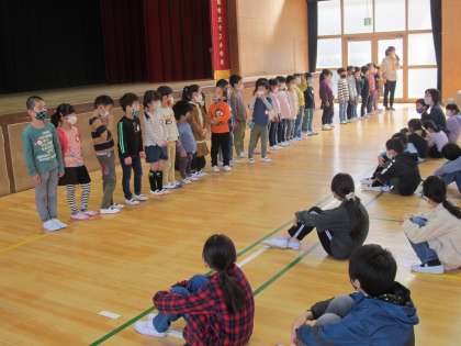 着任式と始業式に続けて、1年生との対面式を行いました。きのう入学したばかりの1年生が、担任の先生に連れられて講堂に入場してきます。2年生から6年生のお兄さんとお姉さん達は、微笑ましい1年生の姿を見て「かわいい♪」と話していました。