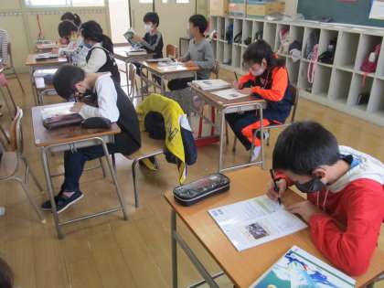 6年生の教室でも、新しい教科書が配られていました。さすが6年生になると慣れたもので、すぐにペンを走らせて名前を書いていました。