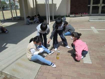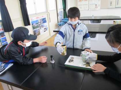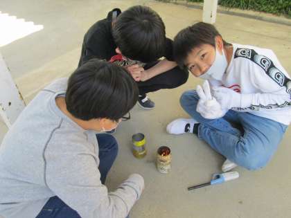 理科室に戻ってバットの上に空きカンの中身を出すと、上が開いているカンは割り箸が残っていましたが、側面に穴が開いているカンは割り箸はすっかり燃えて灰になっていました。二つの空き缶に残った割り箸の様子がまったく違っていて、子ども達はたいへん驚いていました。