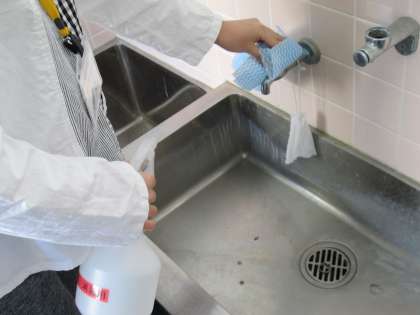 また、ドアノブや手洗い場の蛇口、トイレの照明のスイッチなど、児童がよく手を触れる場所を毎日、教職員が消毒しています。