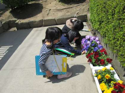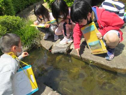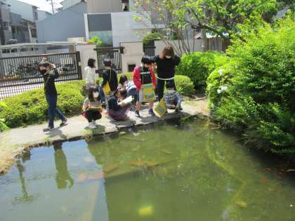 池の中をのぞく、金魚が群れで泳いでいるのや、メダカがすいすい泳いでいます。ツツジの植え込みの上を、アゲハチョウがひらひらと軽やかに飛んでいきます。パンジーが咲いているプランターの横で、女の子がダンゴムシを見つけて手のひらに乗せていました。