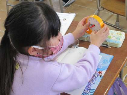 2年生の算数では「時こくと時間」の学習をしていました。子ども達が手にしているのは、時計の教具です。かわいい指でダイヤルを回すと、長針と短針をクルクルと動かすことができます。