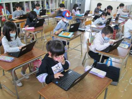 2年生の子ども達はきのう、一人一台端末として整備されたノートパソコンを使い、最初のログインをする練習をしました。個人に付与されたIDとパスワードが書かれたカードを横に置いて、ノートパソコンを開いて画面の枠の中に入力しました。