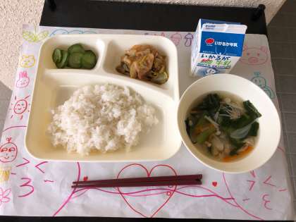 今日はホイコウロー、中華スープ、きゅうりのピリ辛あえ、ごはん、牛乳」でした。
