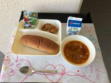 今日は、「一口トンカツ、ミネストローネ、豆こんぶ、黒糖パン、牛乳」でした。