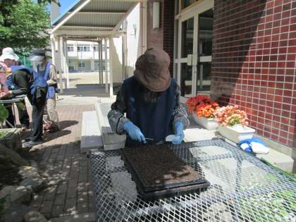 今日は地域ボランティアの方だけでなく、淀川区役所の方も来てくださって、夏から秋に咲く花の種まきをして準備をしてくださいました。