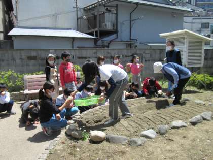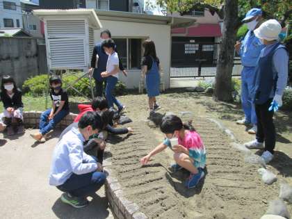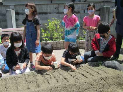 子ども達は指の先で小さな種をつまんで、花壇の土のつけられた浅い溝の中に入れていきます。きゅうくつにならないように間をあけて種を置き、最後に上からやさしく土をかけました。