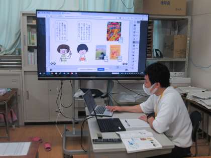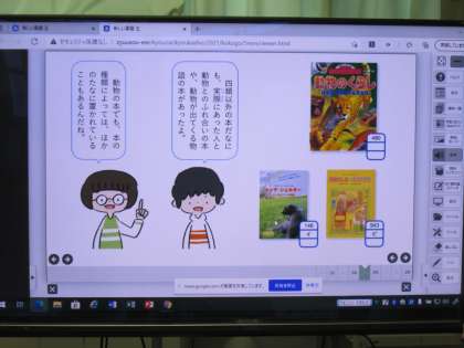 5年生は国語で、図書の分類の学習をしました。5年生では担任が事前に用意したプレゼンテーションの画面を、児童と「資料を共有する」方法で授業をしました。