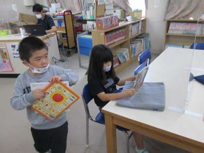 本を選んだ児童は、席にすわって読書をします。図書の時間は向かい合っておしゃべりをすることはないのですが、新型コロナウイルス感染予防のために、図書室の机の上には大きなパーテーションを置いています。