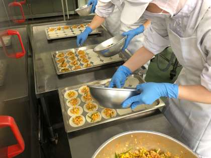 今日はぎょうざの皮を使った「変わりピザ」が登場しました。大阪市でこのピザが作られるようになって、いつも好評です。たくさん作るのはたいへんな作業ですが、お家で手軽に作れます。トースター、ホットプレートでも作れます。