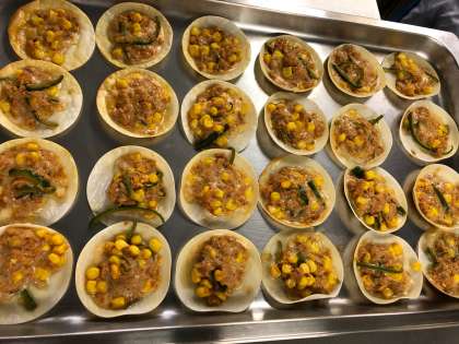 1.材料を混ぜ合わせ、ぎょうざの皮にのせる。