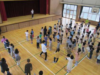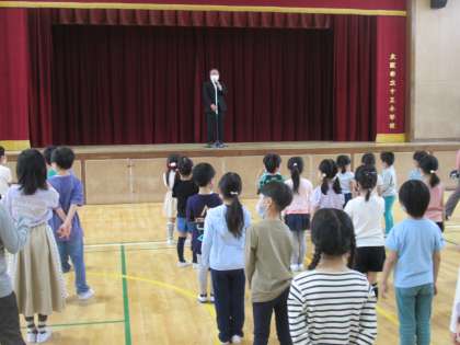 大阪の新型コロナ感染者数が急増し、4月末に緊急態宣言が出て、大阪市の小中学校では学校ですごす時間を短くする対応をとりました。徐々にではありますが大阪の感染者数も減少してきたため、今日からは通常どおりの学校生活が再開されました。一週間のスタート月曜日なので、講堂に全校児童が集まって児童朝会を行いました。講堂の窓を全て開けて換気をし、間隔を大きくとって整列をします。