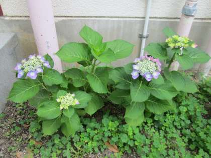 そう、講堂の前にある花壇で、アジサイの花が咲きはじめています。子ども達が学校に来る時間が短くなっていた一か月の間に、季節が春から移り変わり、梅雨の時期になったんですね。今日からふだんどおりに子ども達が登校して、アジサイの花のように笑顔が集まる明るい学校になりそうです。