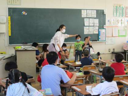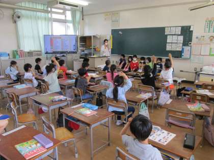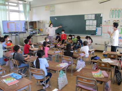 1年生は算数で、「左から〇人目」の学習をしていました。黒板の前に6人のお友達が座って、担任の先生が「左から2人目はだれでしょう?」と問いかけます。