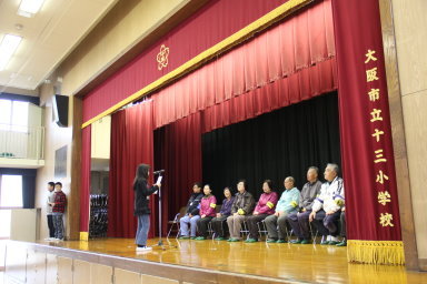 いつも登下校を見守って下さっている「十三見守り隊」「スクールレンジャー隊」「セーフティー淀川」の方々への「見守り感謝の会」を行いました。最初に、子ども達が心を込めて書いた手紙をみなさんの前で読み、いつも温かく見守って下さっている地域の方々へお礼の気持ちを伝えました。
