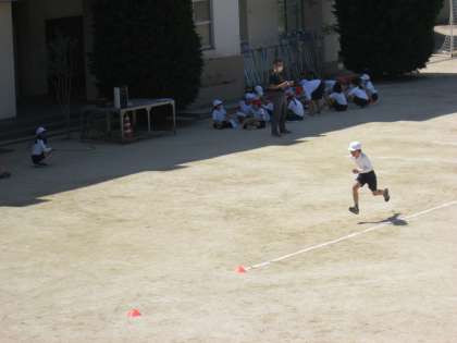 これから取り組むリレーの学習のために、今日は順番にトラック1周のタイムを計測します。始めに軽快な音楽に合わせて準備運動をしてからり、グループに分かれてまっすぐのラインを何本か走り、十分に体をほぐしました。