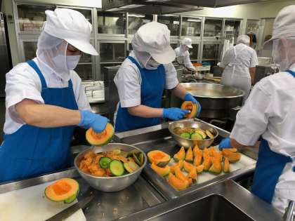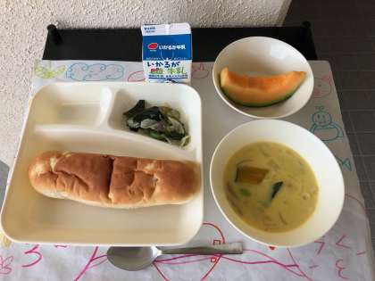 今日はデザートに「クインシーメロン」が登場しました。今日は、茨城県産で、果汁たっぷりの甘いメロンでした。メロンは苦手な人もいましたが、今日のメロンは食べられたという人もいました。