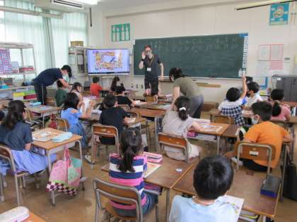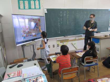 3年生の教室をのぞくと、外国人講師のThomas先生と1から20までの数字の英語を学習していました。黒板の数字をThomas先生が指さして「one,two,three,four…」と発音し、子ども達も一緒に声に出して覚えます。