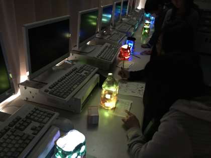 図工でランプを作りました。ペットボトルに紙粘土をつけて自分の思い描く形を作りました。家をモチーフに作ったり、顔をモチーフにしたりと、ユニークなランプがたくさんできました。完成後は、パソコン室を暗くして鑑賞会を開きました。いろんな色に光ってとてもきれいでした。