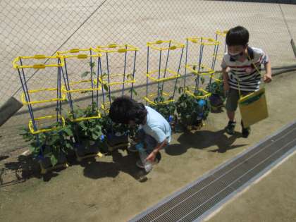 授業の最後にはアサガオの植木鉢を大事そうに両手で持って、日が良くあたる場所まで運んで並べます。「暑いからアサガオもノドかわいてるわ。」と言いながら、たっぷりと水をあげていました。