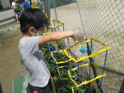 1年生が毎日、水やりをして育てているアサガオが、夏の日を浴びてグングン育っています。葉っぱが増えて大きくなり、1年生が自分の手のひらと比べっこすると同じぐらいの大きさでした。