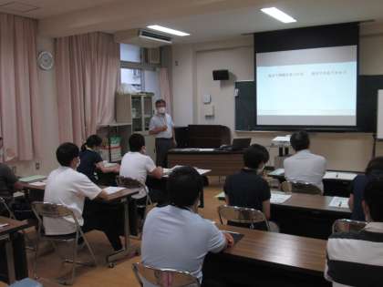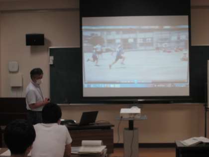 5年生がリレーで研究授業を、そして6年生がソフト・バレーボールで研究授業を行った頃は大阪に緊急事態が出されていたため、少し日をおいて今回の研修会を持つことになりました。研修会では柴山先生が用意してくださった資料とともに、当日の授業を撮影した動画なども流して振り返り、研究授業の実践の中で良かった点や改善すべき点などについてお話をしてくいただきました。