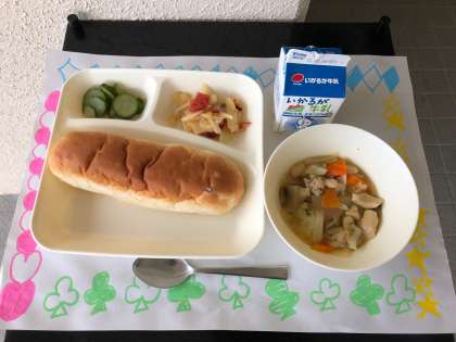 今日は、旬のトマトを使った「じゃがいもとトマトのチーズ焼き」でした。薄く切ったじゃがいもとベーコンに塩とこしょうで下味をつけ、ミニバットに入れて、更にトマトを入れ、上からチーズをのせて焼き物機で焼き上げました。表面はカリッと香ばしく、中のじゃがいもはほくほくとしていていました。トマトが嫌いだけど食べられたよと言っていた児童もいました。