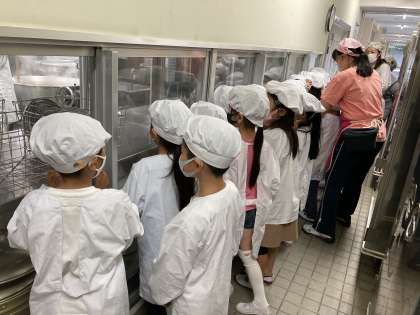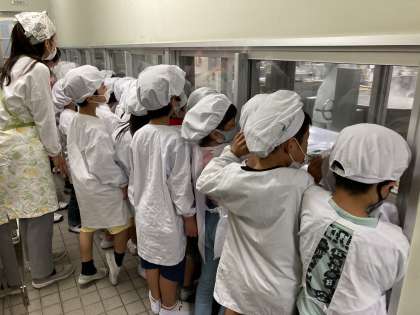 1年生が、給食室に見学に来ました。給食室の中には入られないので、児童が給食を取りに来るところからのぞくように見学しました。給食調理員さんから聞いたところ、カレールウを釜に入れるところは「わー」と歓声が給食室の中まで聞こえたそうです。