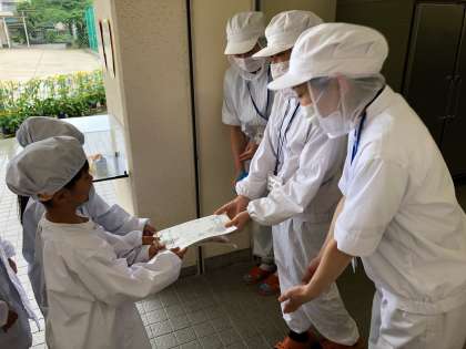 見学を終えた後、給食室の中の様子のビデオを教室で見て、給食室の様子をもっと知ることができました。また、1年生は給食調理員さんにお手紙も渡しました。