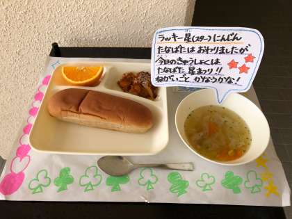 今日は「がぼちゃのミートグラタン、スープ、オレンジ、黒糖パン、牛乳」でした。今日のスープにはラッキースターにんじんを入れました。7月なので、七夕にちなんでたくさんの星を入れました。