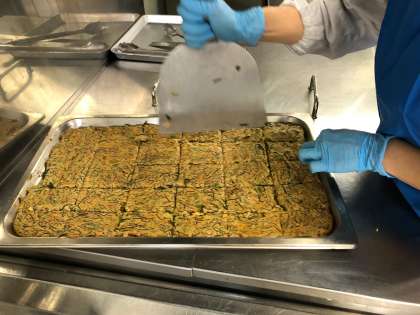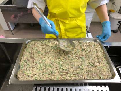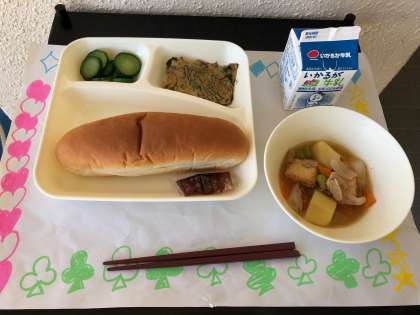 今日は、1学期最後の給食でした。献立は、「もずく入りヒラヤーチー、豚肉とあつあげの煮もの、あっさりきゅうり、大型コッペパン、いちごジャム、牛乳」でした。