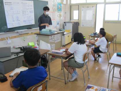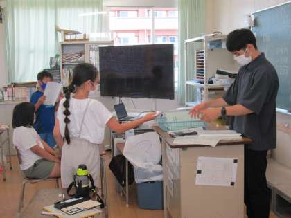 4年生の子ども達は、担任の先生から配られた夏休みの宿題を見て、質問をしていました。先生が質問に一つ一つ丁寧に答えた後、いよいよ通知表を渡します。