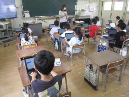 2年生の教室でも机の上にノートパソコンを置いて、担任の先生がデジタルドリルを入れる方法を説明していました。IDやパスワードを打ち込むのにとまどう子もいましたが、先生や支援員さんに手伝ってもらってデジタルドリルを始めることができました。