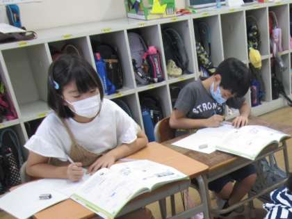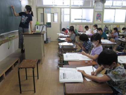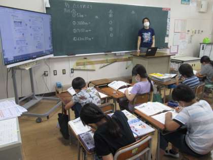 3年生の教室では算数の授業をしていました。これまで学習してきた長い距離の表し方のたしかめの時間で、子ども達はふりかえりの問題に集中して取り組んでいました。