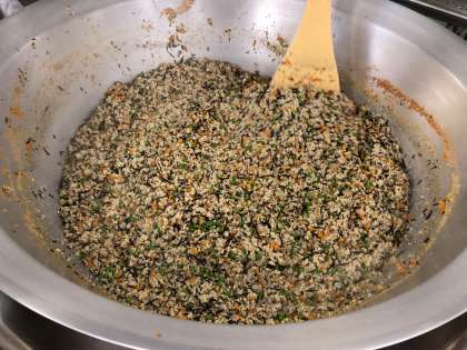 2.油を熱し、豚ひき肉をいため、にんじん、ひじきをいため、だし汁を加えて煮る。