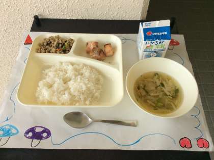 今日の給食は「さけのしょうゆ風味焼き、五目汁、高野どうふのいり煮、ご飯、牛乳」でした。高野どうふのいり煮は高野どうふの粉末を使用し、ご飯によく合うおかずでした。