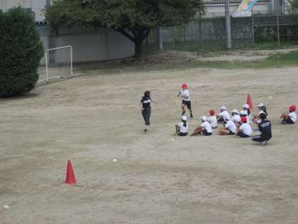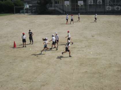 季節は秋になり運動場を吹く風も爽やかなので、スポーツを思いっきり楽しむにはぴったりです。6年生は体育でリレーの学習をしていました。リレーの醍醐味は何と言っても、息のあったタイミングで行われるバトンパスです。6年生の子ども達も担任の先生からヒントをもらってから、チームに分かれてバトンパスの練習に取り組みました。
