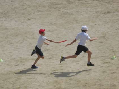 次の走者がスタートを切る距離や、バトンを受け渡すときの掛け声など、お友達同士で意見を出し合って改善を重ねていました。運動会では6年生の子ども達が、観客を盛り上げるレースを見せてくれることを期待しています。