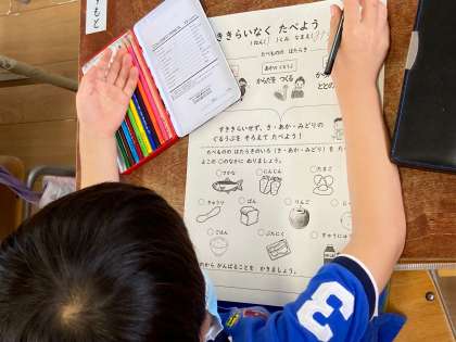 1年生ですききらいなくたべようという主題で食育指導を行いました。食べ物は働きによって3つのグループに分けられることを知り、みんなで今日の給食を3つに分けました。好き嫌いをしてしまうと3つのグループの色の食べものが少なくなってしまうことを気づき、自分の苦手な食べ物が何色のグループなのかも知りました。
