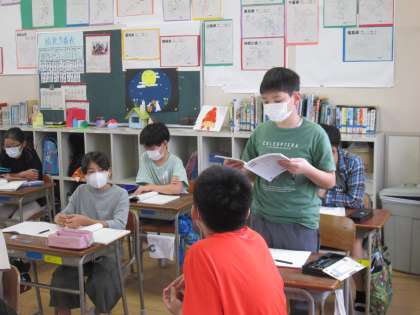 9月の初旬から教育実習生が来て、5年生の学級で研修や実習をしています。3限目は実習生が国語の授業を行い、「水のこころ」という詩を音読するためにどんな工夫をしたらいいかについて学習をしていました。