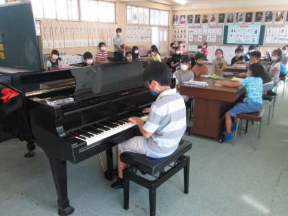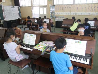 2限目、3年生の子ども達は音楽室に移動して、オルガンの練習をしました。新型コロナウイルス感染予防のために音楽の授業では、歌ったりリコーダーを吹いたりといった学習を長い時間することができません。その点、オルガンの練習はマスクを着用したまま行うことができるので、たっぷりと取り組むことができます。