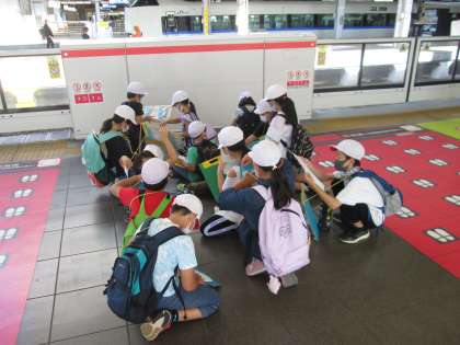 社会で学習している大阪の街の様子を、大阪環状線の電車に乗ってぐるっと一周、見てまわります。探検ボードに挟んだワークプリントを読んで、駅の名前とその近くで見える大きな建物を確認します。梅田スカイビルや大阪ドーム、天王寺公園など、ランドマークを見つけると、子ども達は嬉しそうにほほえんでいました。(3枚目は大阪城公園駅から見えた大阪城です。)