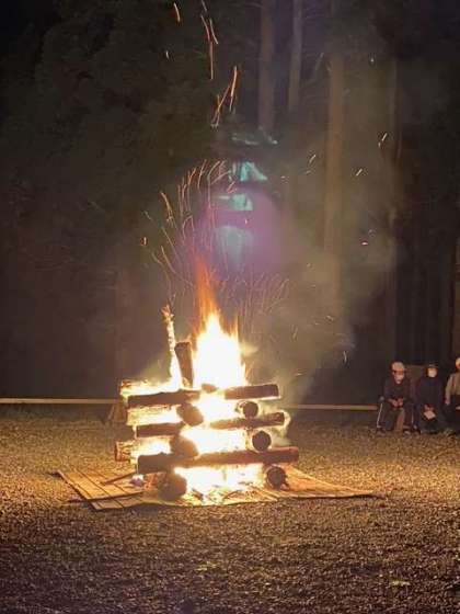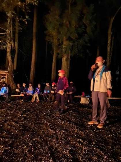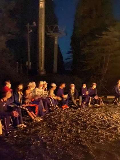 キャンプファイヤーをしました。楽しいゲームで大いに盛り上がりました。体調を崩す人もなくみんな元気です。空を見上げると綺麗な星空が広がっていました。まもなく就寝です。明日の活動が楽しみです。