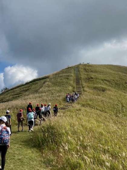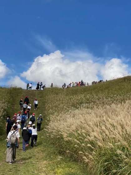 山登りをしました。みんなで励まし合って全員高丸山まで登ることができました。ススキが風に揺れてとても綺麗です。頂上でみんなで記念写真を撮りました。