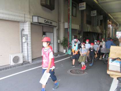 班でまとまって歩き、十三の街を30分ほどで一回りして小学校に帰ってきました。