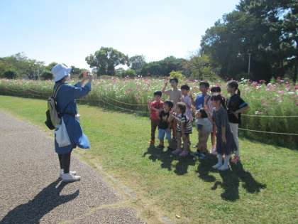 オリエンテーリングの最後のポイントは、服部緑地公園の真ん中にある円形花壇です。ピンクや白色のコスモスがたくさん咲いている前で、班で並んで笑顔いっぱいの写真を撮りました。