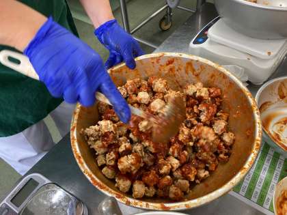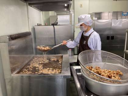 まぐろのオーロラ煮は、カラッと揚ったまぐろのからあげに甘辛いたれでからめた、給食でも大人気の献立です。
