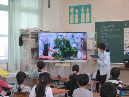 今日の給食ではホウレンソウが使われるということで、給食室に届いたホウレンソウを調理している映像も見せてもらいました。給食室の中の大きな調理台に、大量のホウレンソウが乗っているのを見て、子ども達はとても驚いていました。