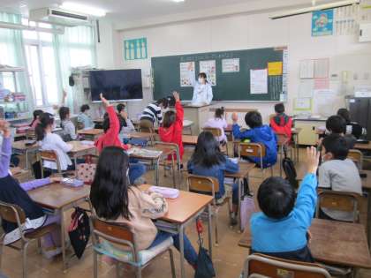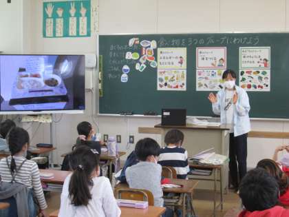 3年生の子ども達は栄養士の先生といっしょに食育の授業をしました。今回のテーマは、「食べ物を3つのグループに分けよう」です。まず始めに3つのグループについて、木曜日の給食の食材を使って復習しました。